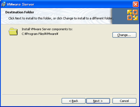 インストール先ディレクトリを選択します。デフォルトから変更する場合は「Change」をクリックしてください。問題なければ「Next」をクリックします。