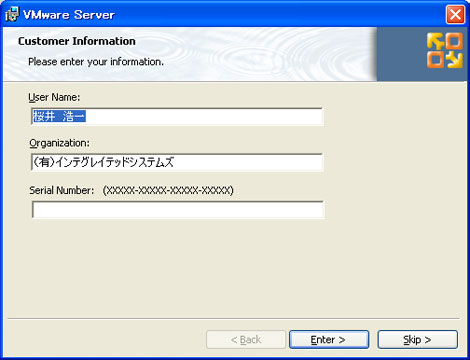 インストール完了後、シリアル番号入力画面が表示されます。VMWareから送付されたメールに記載されていますので、入力してください。