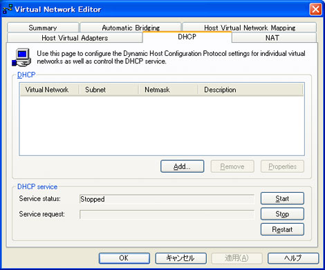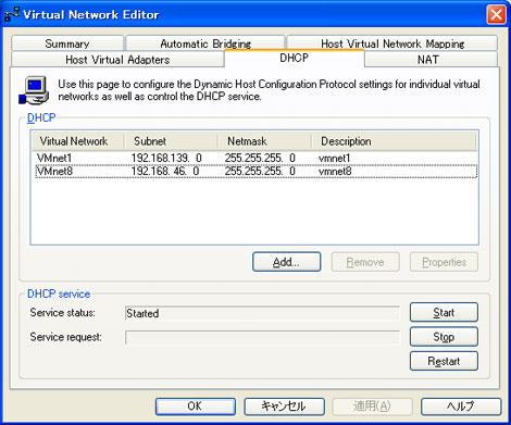 スタートメニューから「VMWare」-「VMWare Server」-「Manage Virtual Networks」を選択してください。次の画面が表示されますので、DHCPタブを選択してください。